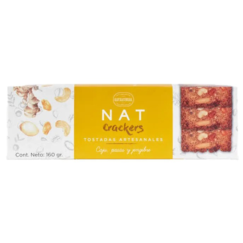 Estuche de tostadas artesanales con caju, pasas y jengibre Nat Crackers 160g. Chile